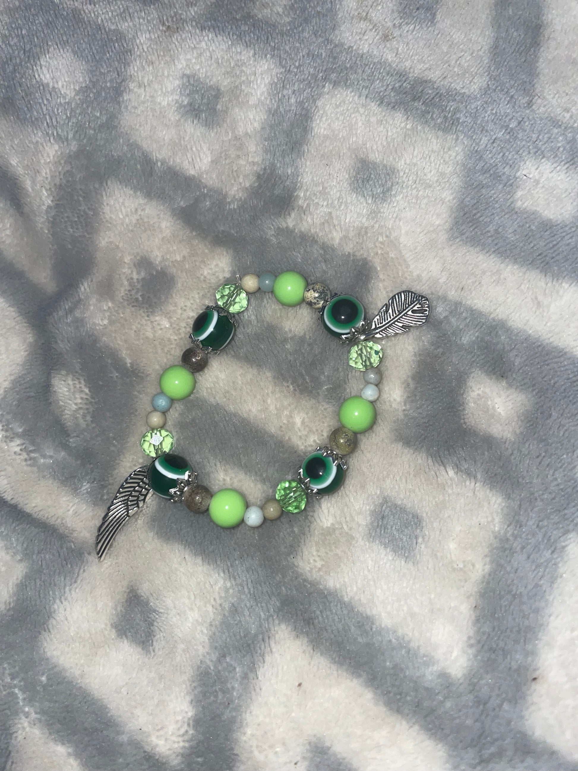 Ocean jasper/ moss Adgate with green eyes; feather and angel wing charms