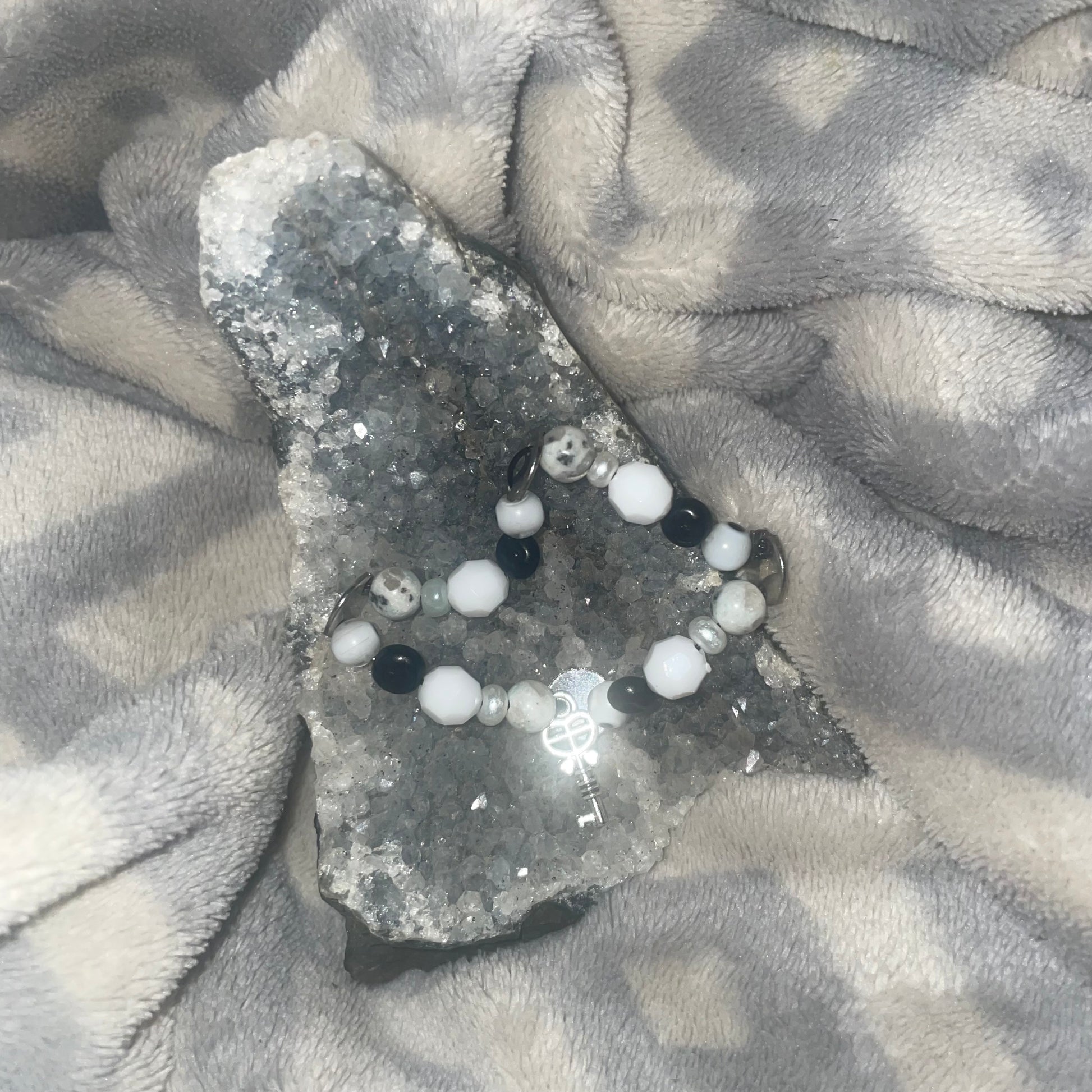 White evil eyes with kiwi jasper and a key charm