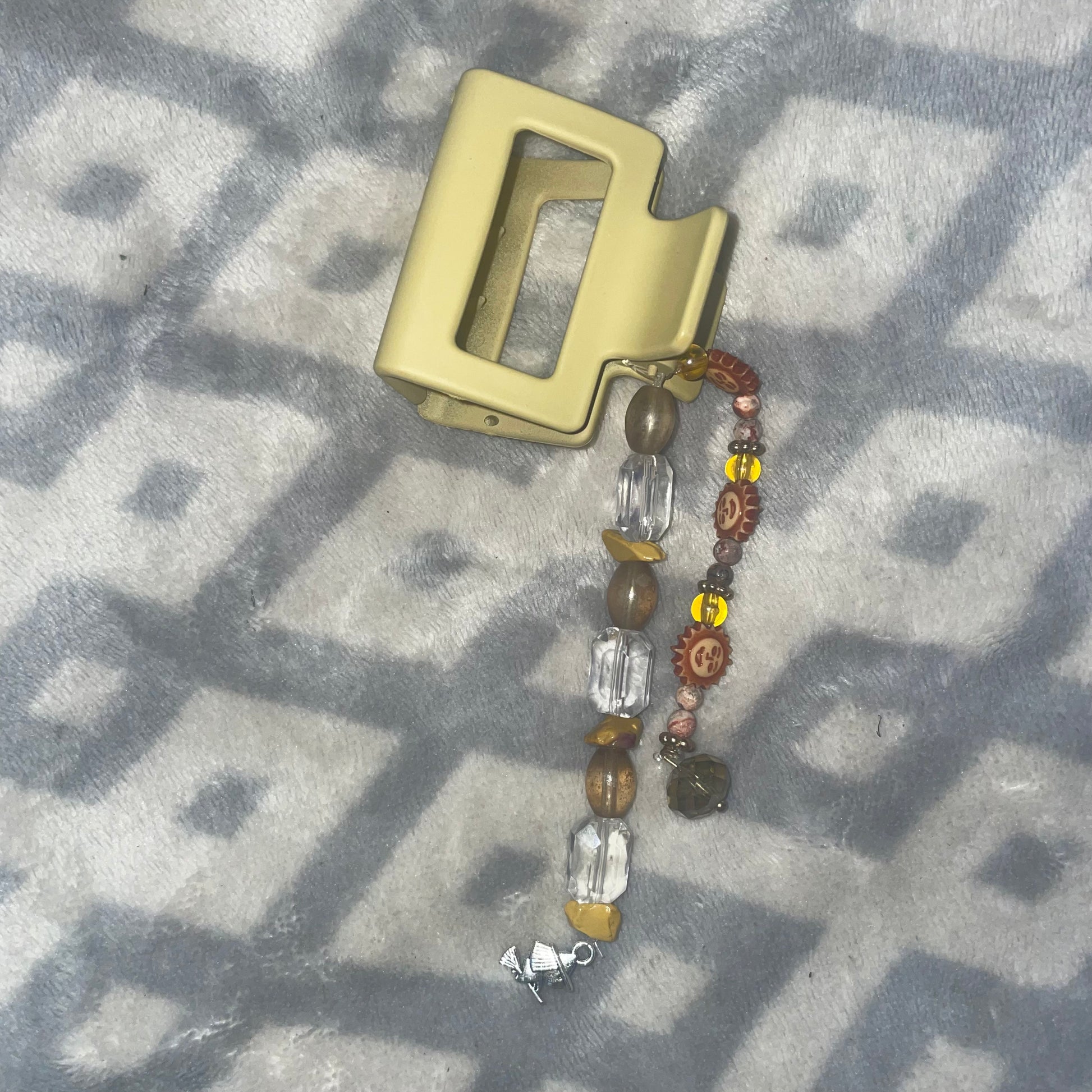 Medium Tan clip with leopard jasper and moonkite with witch on a broom charm