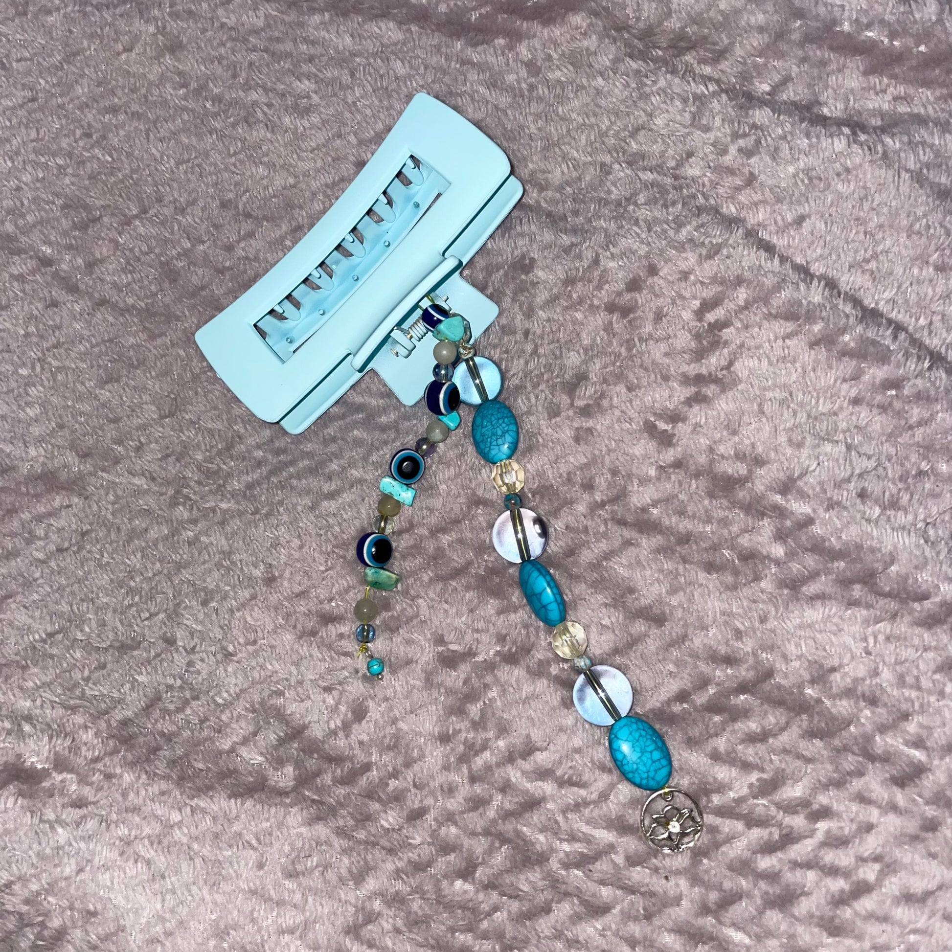 Large light blue rectangular clip with turquoise, aventurine, Chrysocolla, dark blue eyes and a lotus charm!