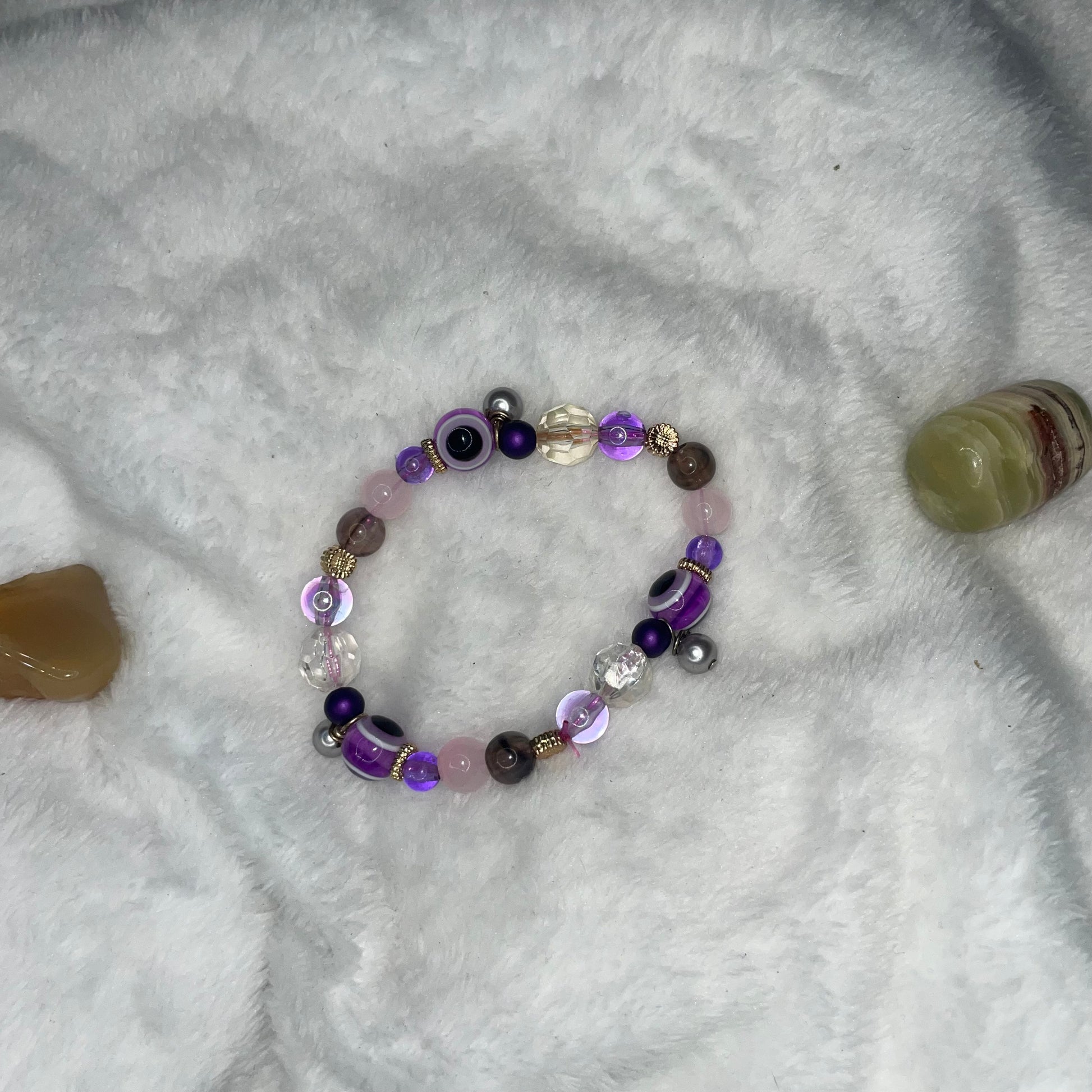 bracelet #2 purple and gold accents with purple evil eyes and golden flowers with little pearl charms Size 7 in