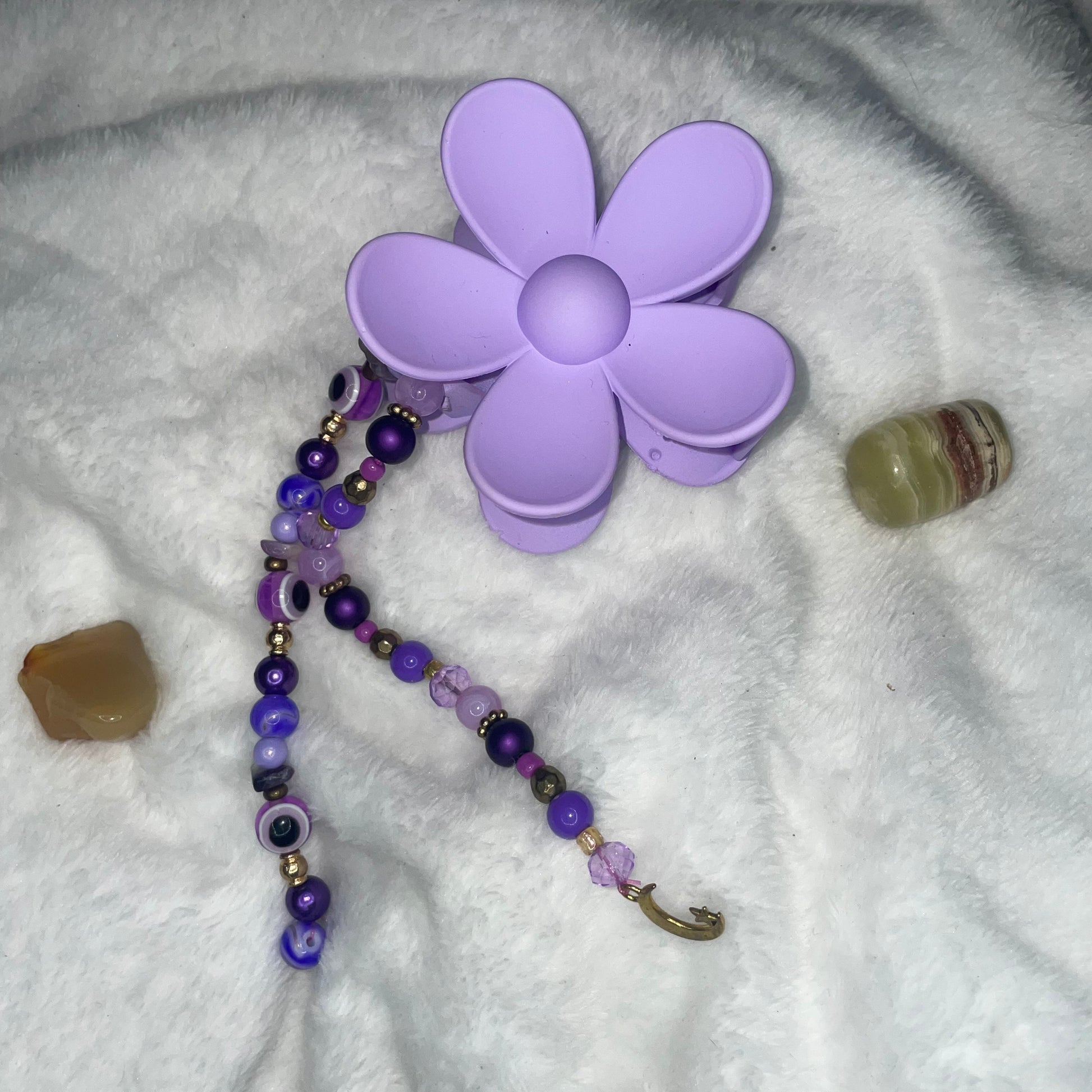 A medium sized purple flower shaped hair clip with amethyst chips and purple evil eyes and a gold moon and star charm