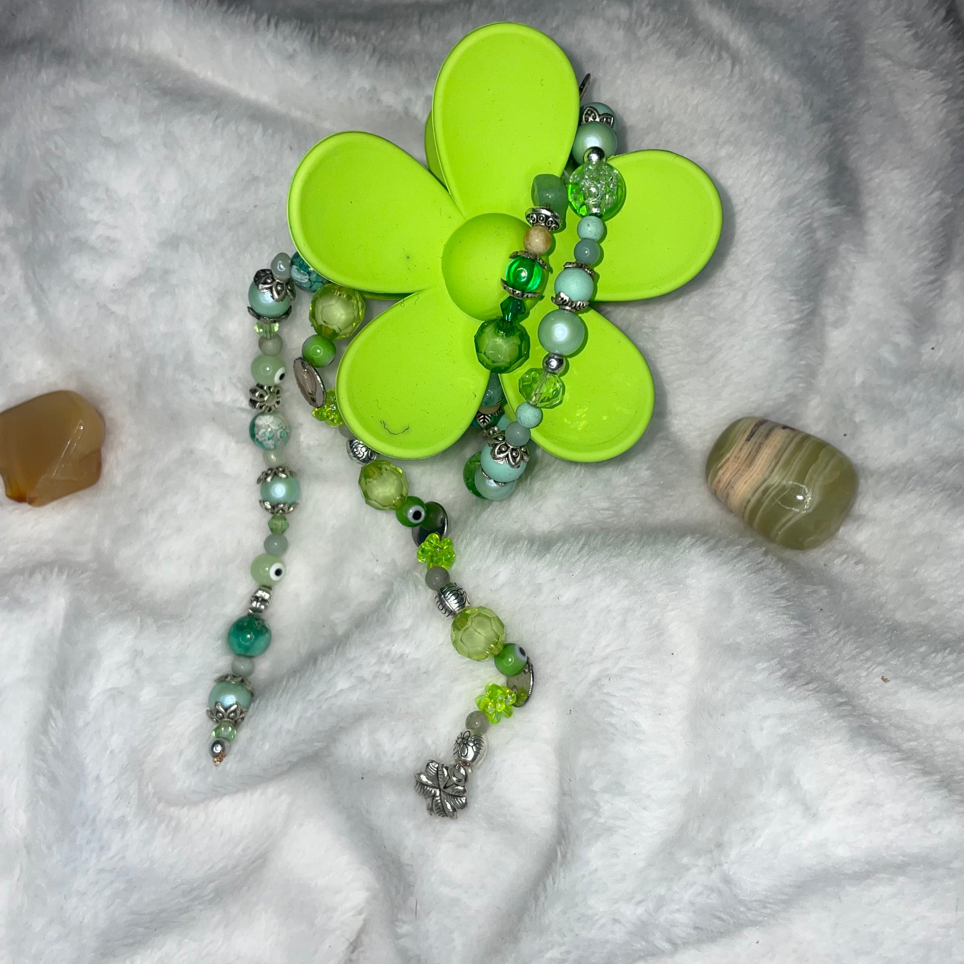 A medium size green flower shaped hair clip with ocean jasper and green evil eyes with sliver flowers and 4 leaf clover charm
